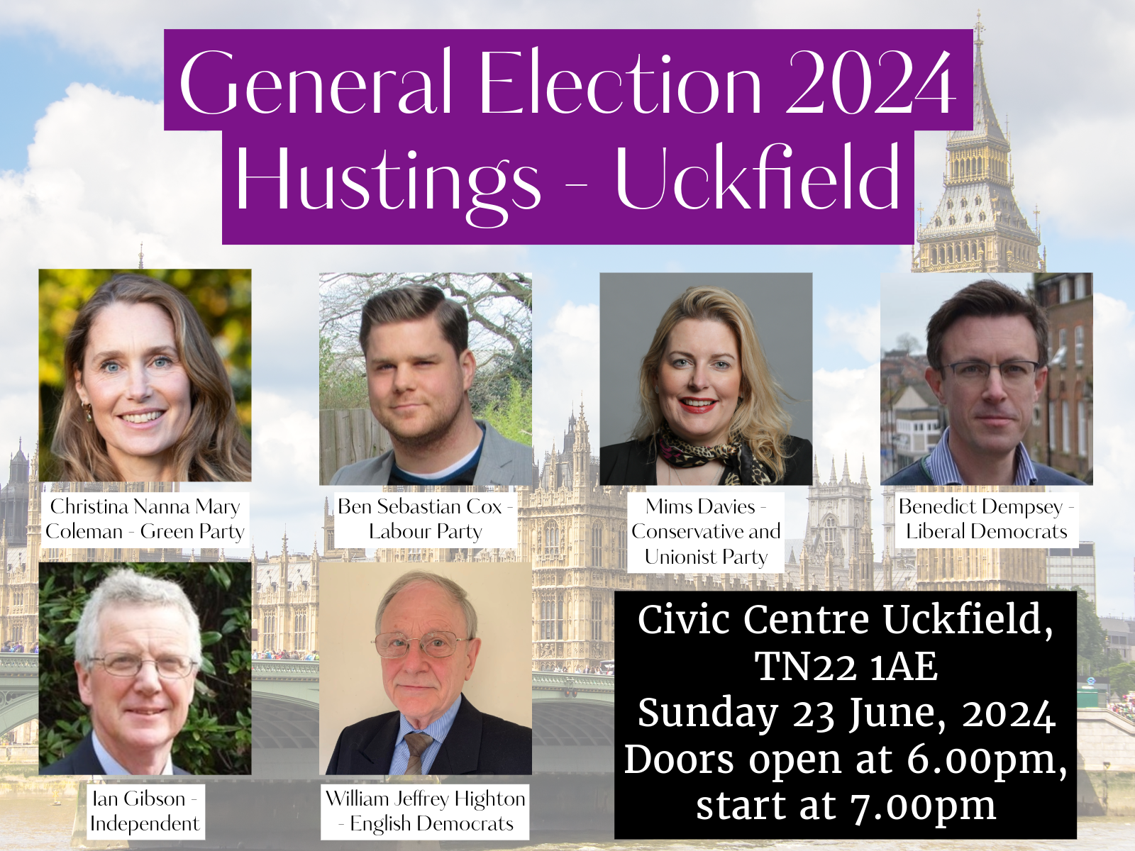 All six candidates for the constituency have confirmed their attendance: Christina Coleman (Green), Ben Cox (Labour), Mims Davies (Conservative), Benedict Dempsey (Liberal Democrat), Ian Gibson (Independent) and William Jeffrey Highton (English Democrats). The event will be chaired by Ian Noble, Director of the Uckfield Chamber of Commerce.