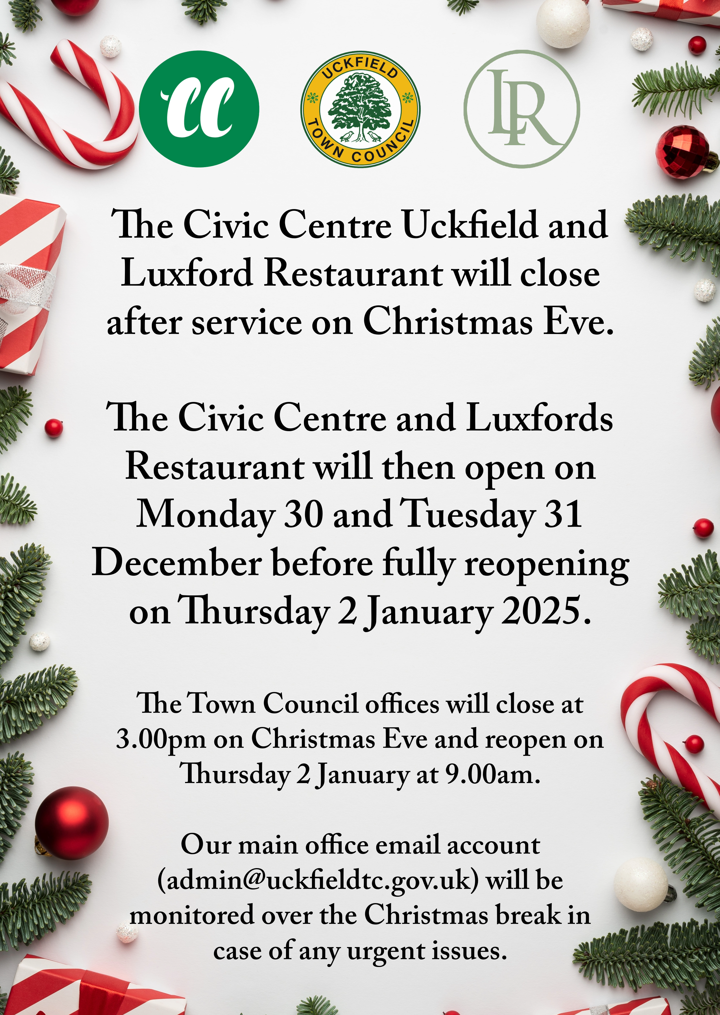 The Town Council offices will close at 3.00pm on Christmas Eve and reopen on Thursday 2 January at 9.00am. Our main office email account (admin@uckfieldtc.gov.uk) will be monitored over the Christmas break in case of any urgent issues.