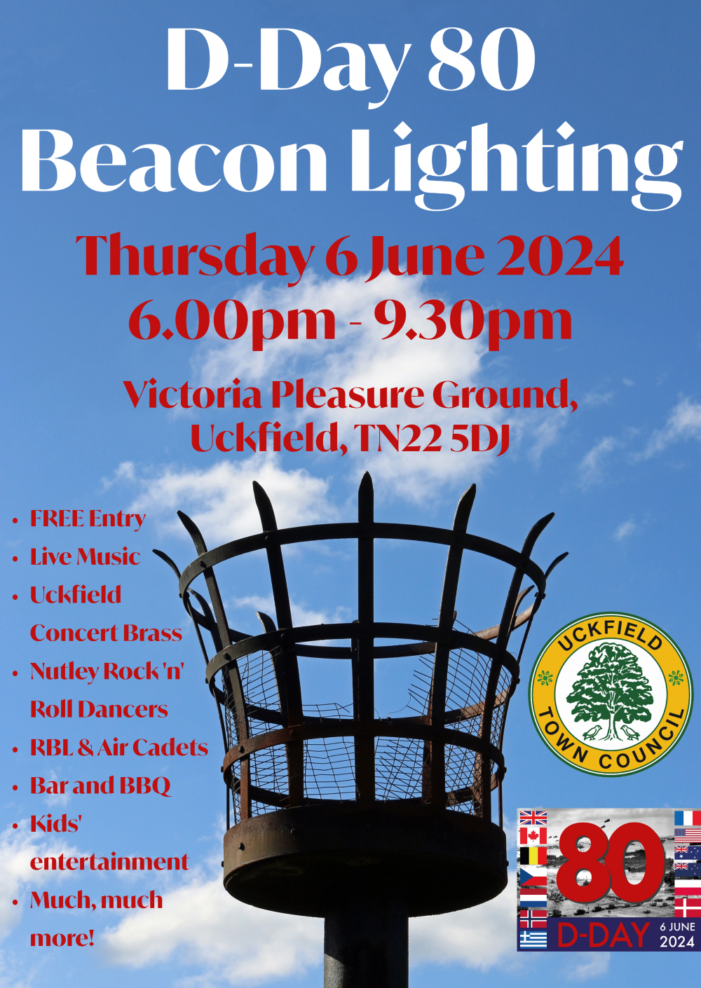 The Town Council are then hosting the D-Day 80 Beacon Lighting commemoration at the site of Uckfield’s beacon on Victoria Pleasure Ground, at the top of Old Timbers Lane, Uckfield, TN22 5DJ.